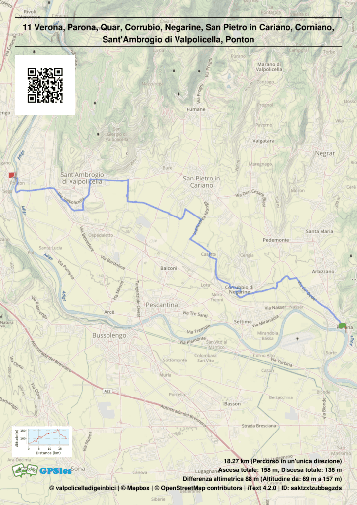 Percorso pianeggiante in strade secondarie con qualche limitata rampetta breve; due brevi tratti sterrati prima di Corrubbio e dopo villa Galtarossa fino a Prunea. La segnaletica ha inizio da Arbizzano : Da Ponton, seguendo l’itinerario 46, attraverso Ceraino, Dolcè, Peri si prosegue sulla ciclovia “Terra dei Forti”.